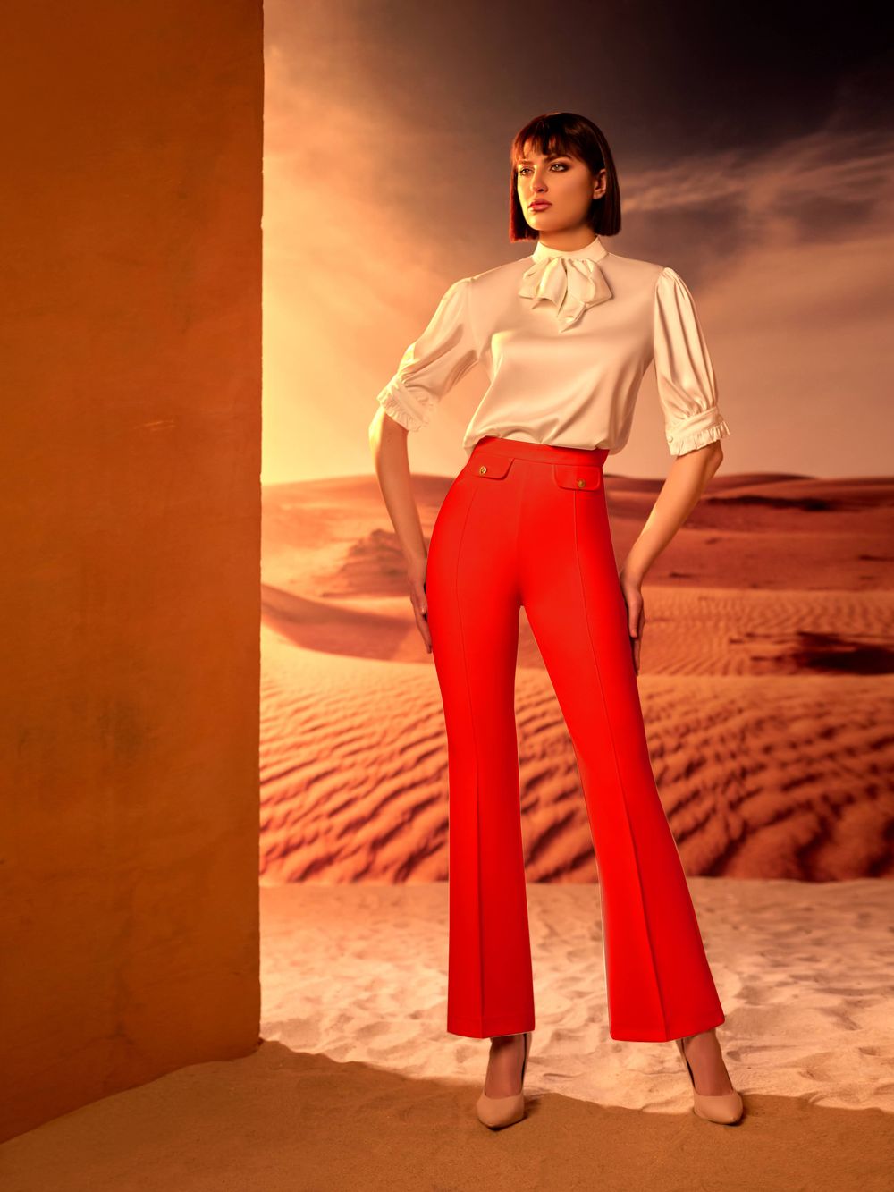 High neck blouse bow detailed in satin fabric High-waisted trouser in 2 front flap pockets with golden buttons in crepe fabric