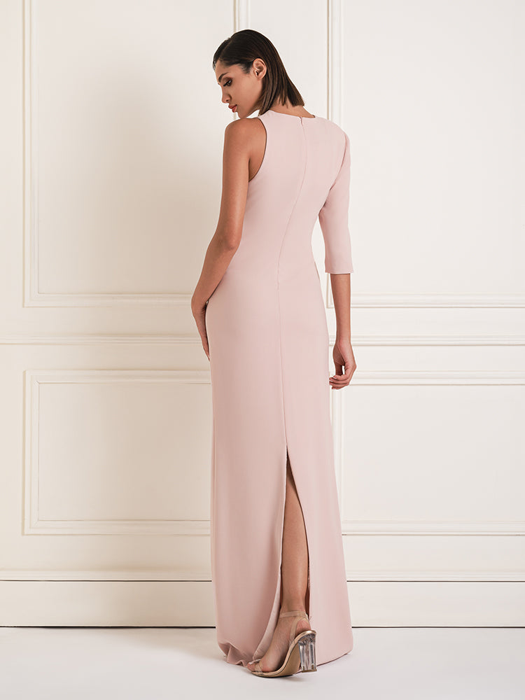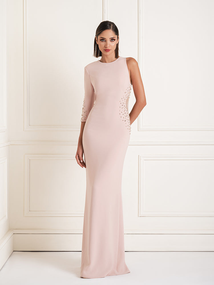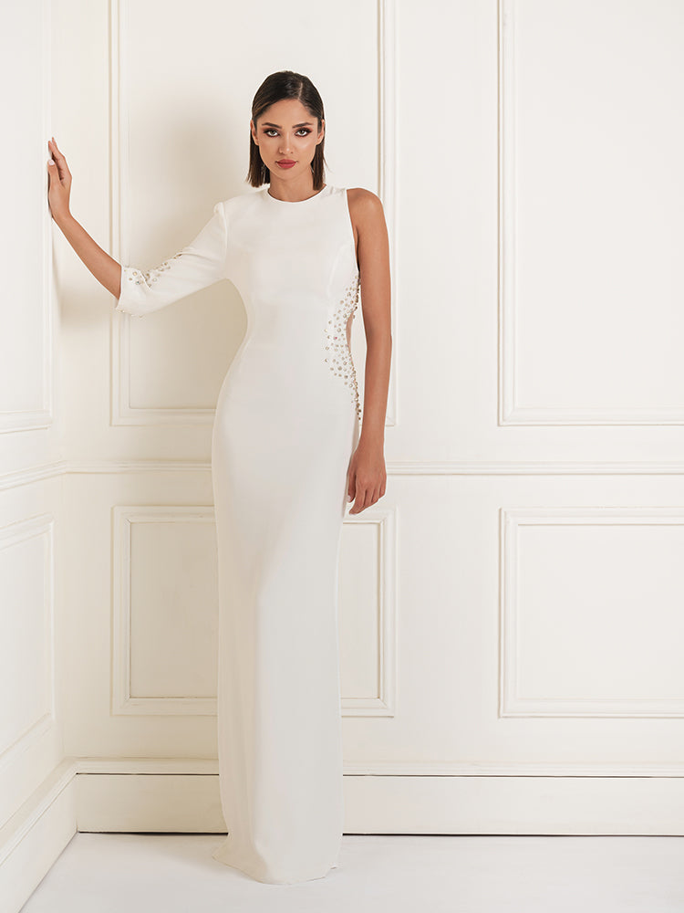 This striking dress features an asymmetrical design with a unique waist cutout adorned with sparkling crystals. Perfect for special occasions, it combines modern style with glamorous details to create a captivating look.