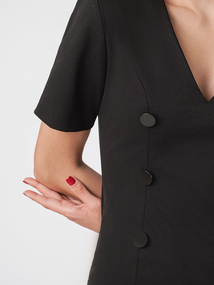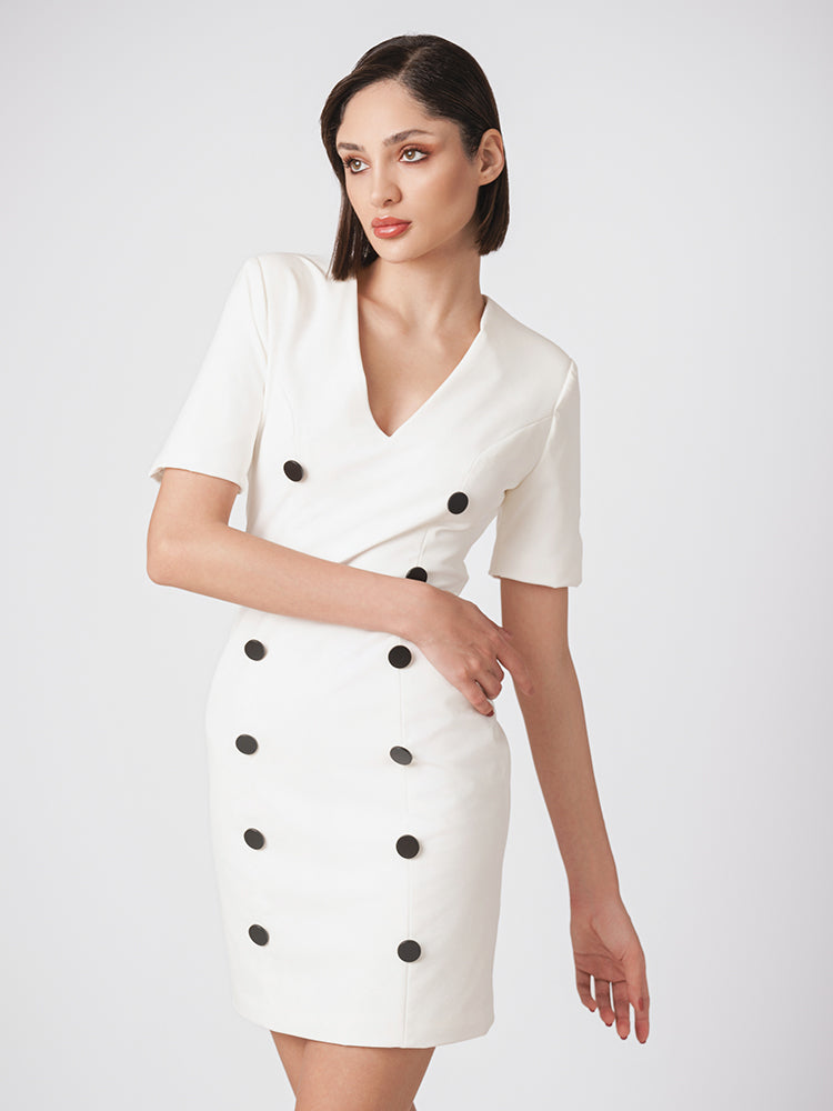 Introducing our chic Fitted Short Length Dress – a modern classic for any occasion. With its sleek silhouette and distinctive button detailing running down both sides, this dress is a true statement piece. Crafted for both style and comfort, it seamlessly transitions from day to night.