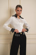 A polished blouse elevated with a contrast collar and delicate pearl embellishment. The clean tailoring, structured cuffs, and refined detailing create a modern, feminine finish