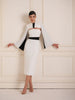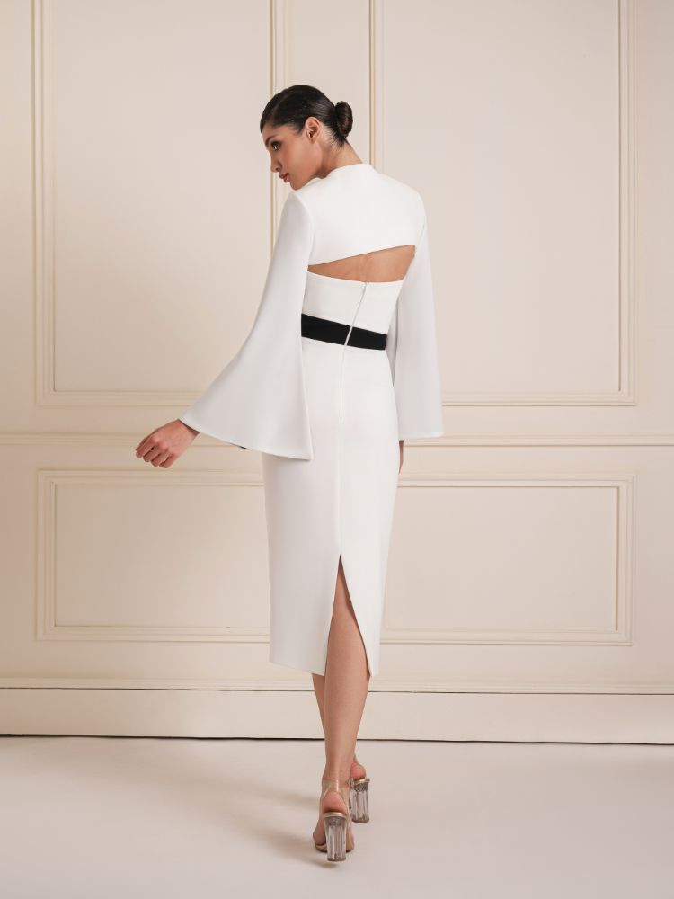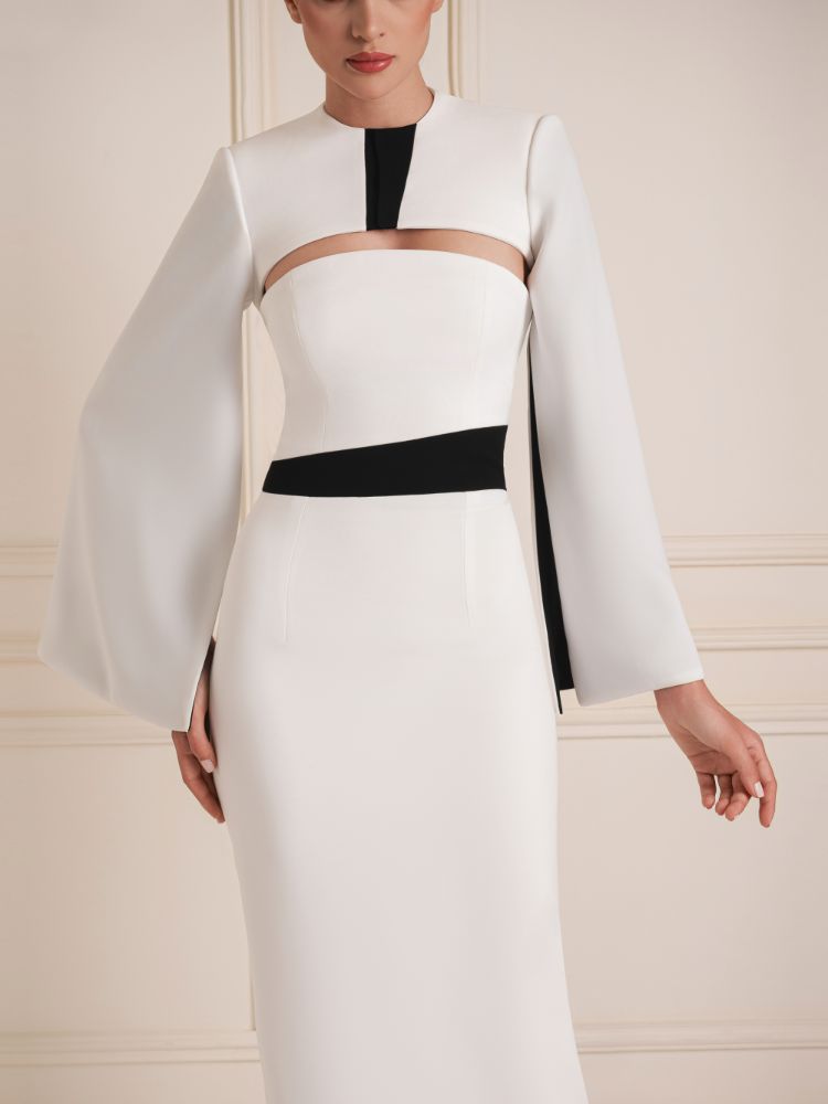 Striking in its simplicity, this black and white dress features dramatic flare sleeves and clean contrast lines that sculpt and elongate the silhouette. A bold yet timeless piece designed to make a statement with ease.