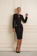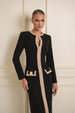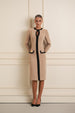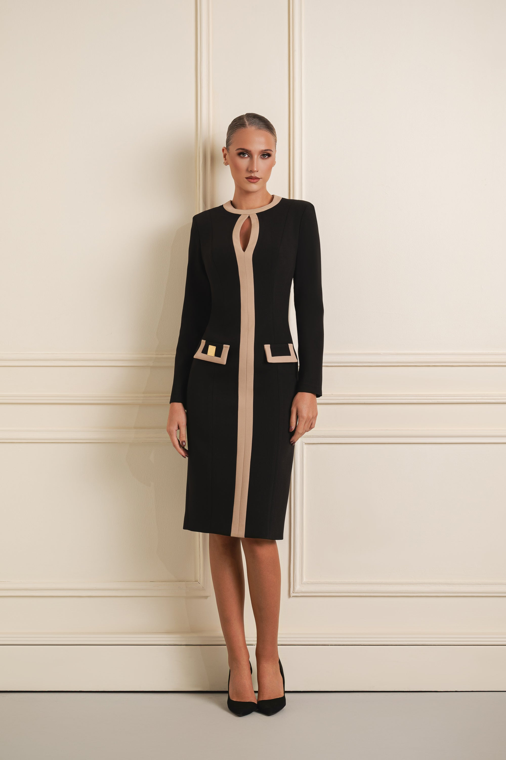 A refined midi dress defined by clean tailoring and an elongated contrast panel. Its sculpted silhouette, structured shoulders, and subtle pocket detailing create a look that is sharp, feminine, and effortlessly elegant.