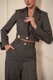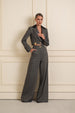 A structured cropped blazer paired with wide-leg, high-waisted trousers. Defined by contrast details and bold buttons, this tailored set blends sharp structure with effortless modern elegance.