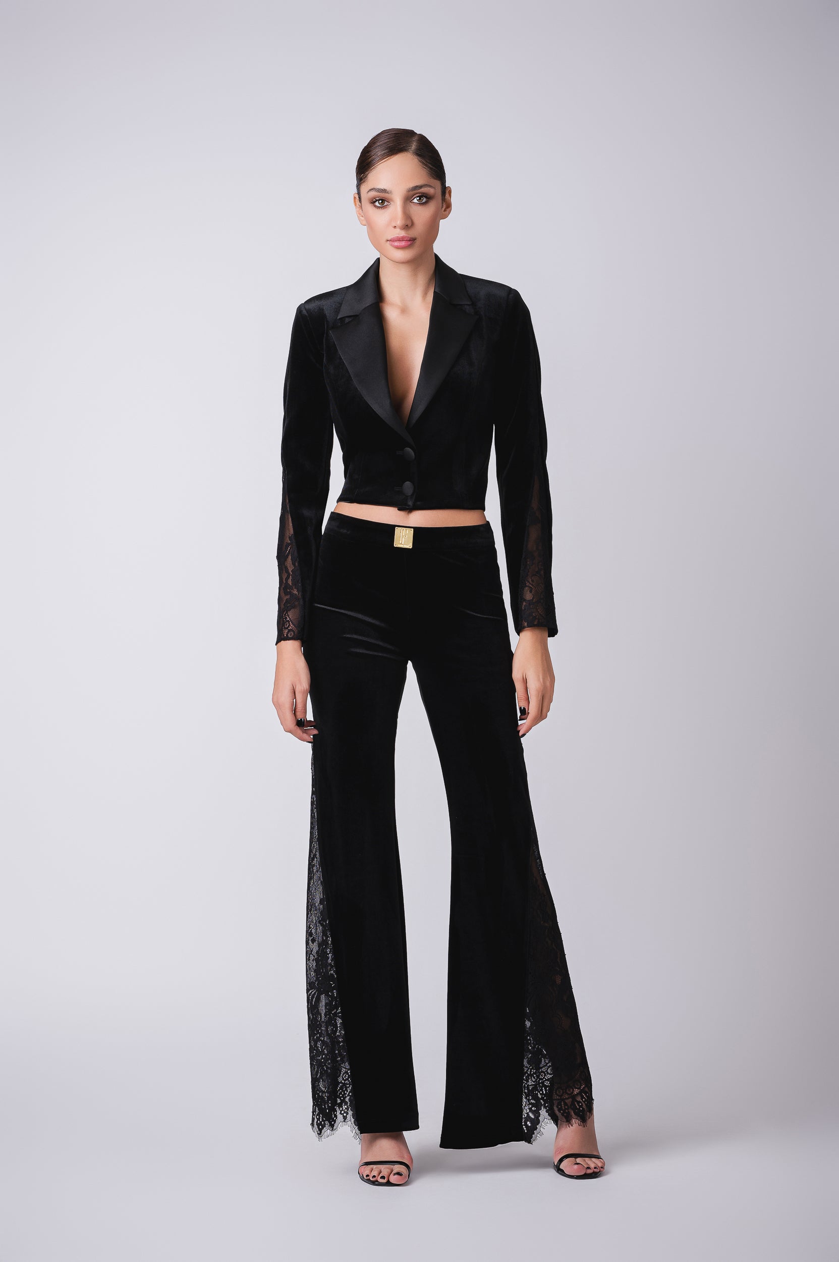 Introducing our Deep Plunge Velour Cropped Jacket paired with Flair Lace Detail Pants, a chic and captivating ensemble that exudes modern style and sophistication. The cropped jacket features a deep plunge neckline, adding a bold and alluring element to your look. The velour material exudes luxury, while the lace detail on the pants provides a touch of refinement and playfulness.