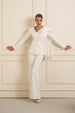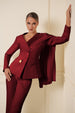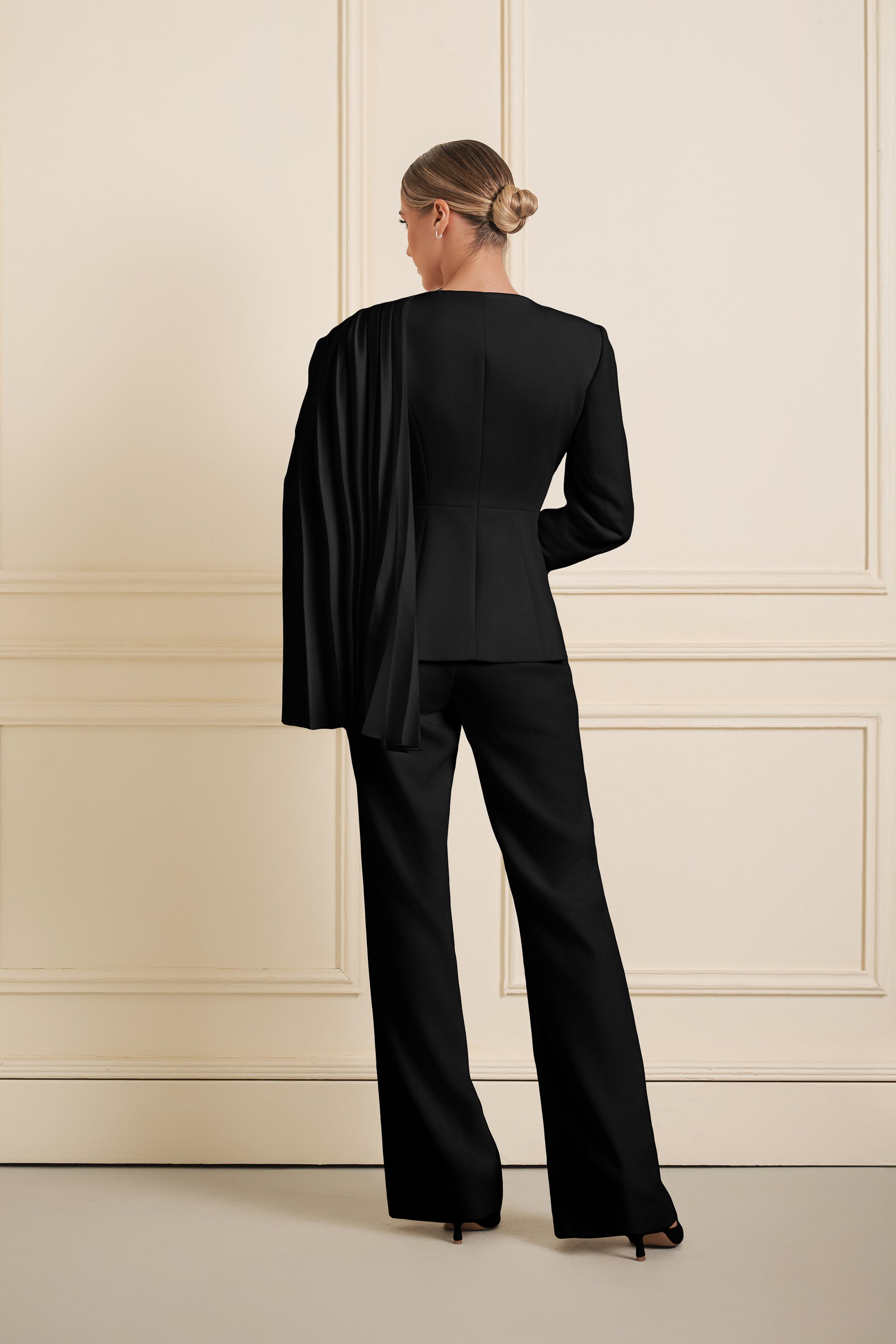 A refined suit set featuring a sculptural draped shoulder and a fluid pleated panel that adds movement and modern elegance. Paired with sleek straight-leg trousers, it balances structure and softness for a confident, distinctive silhouette.