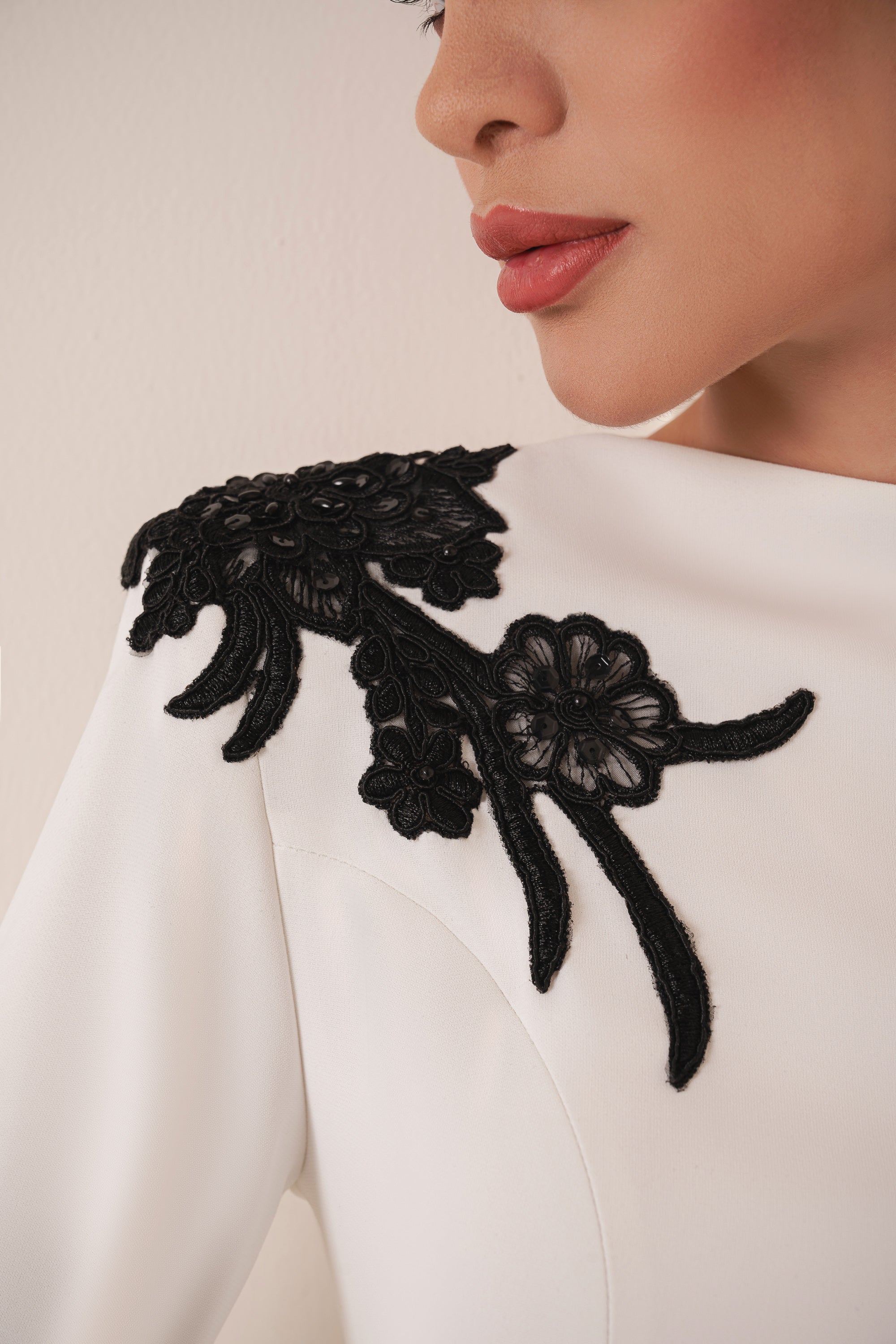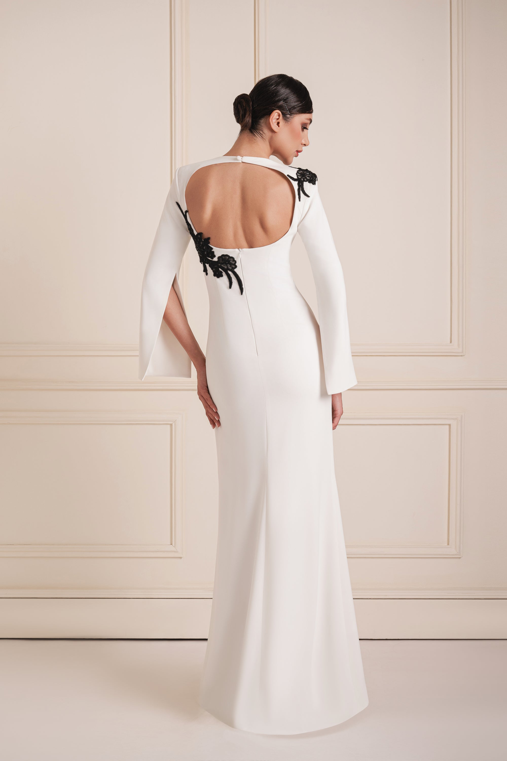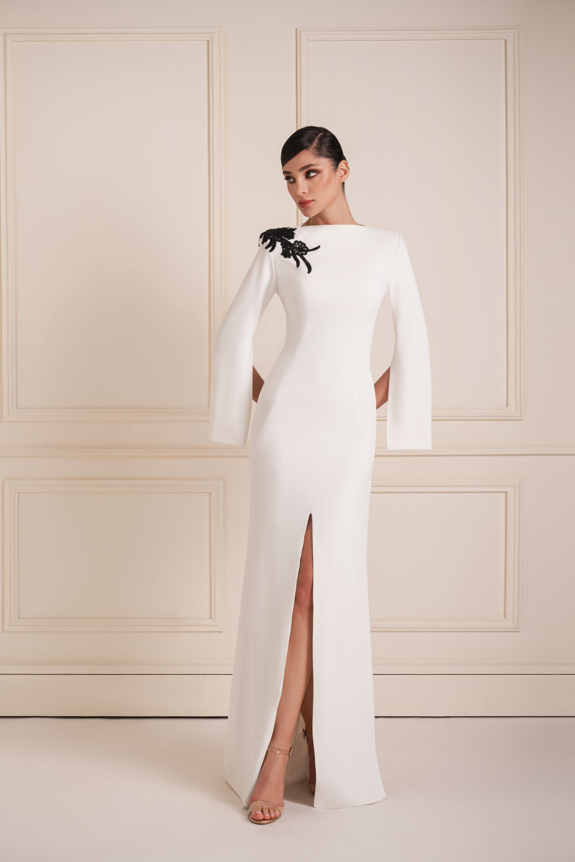 A vision of refined glamour, this fitted floor-length dress features a sleek silhouette with slit sleeves for fluid movement. Embellished shoulders add a touch of opulence, making it a statement of effortless sophistication.