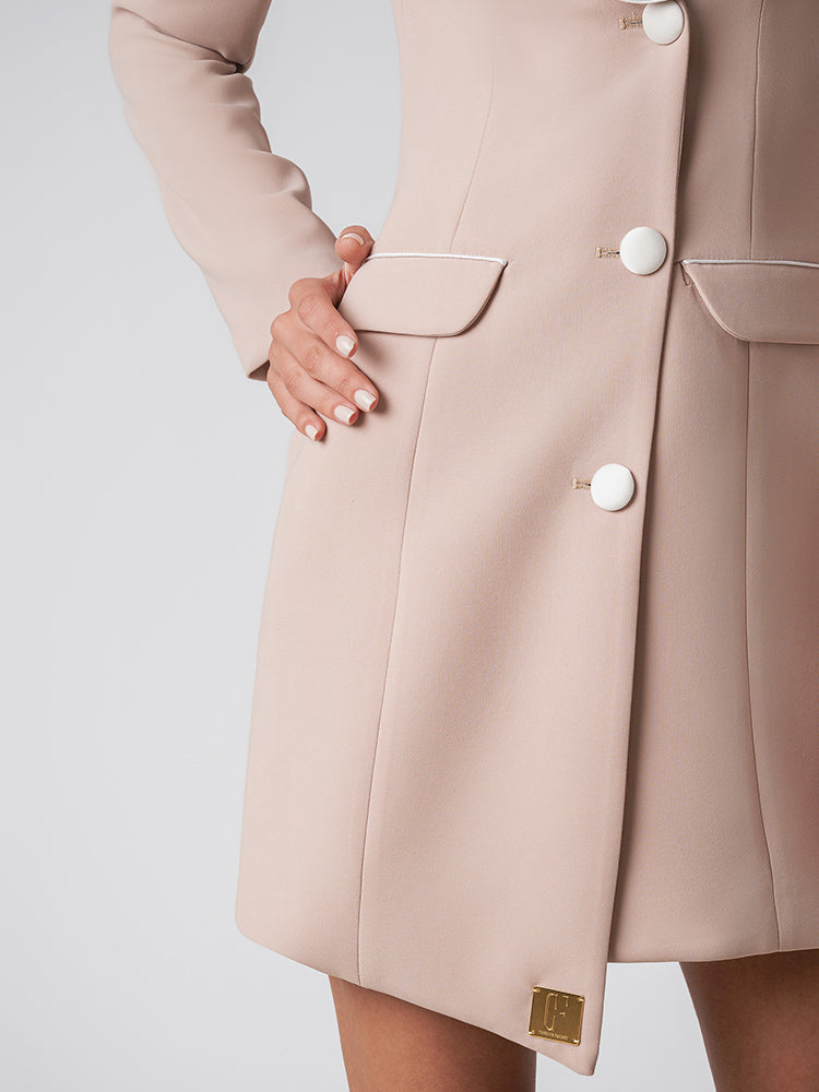 Make a statement with our Faux Pocket Blazer Dress featuring contrast trim. This chic piece combines tailored elegance with modern flair, showcasing faux pockets and sleek contrast detailing. Perfect for any occasion, it offers a polished look with a unique twist.