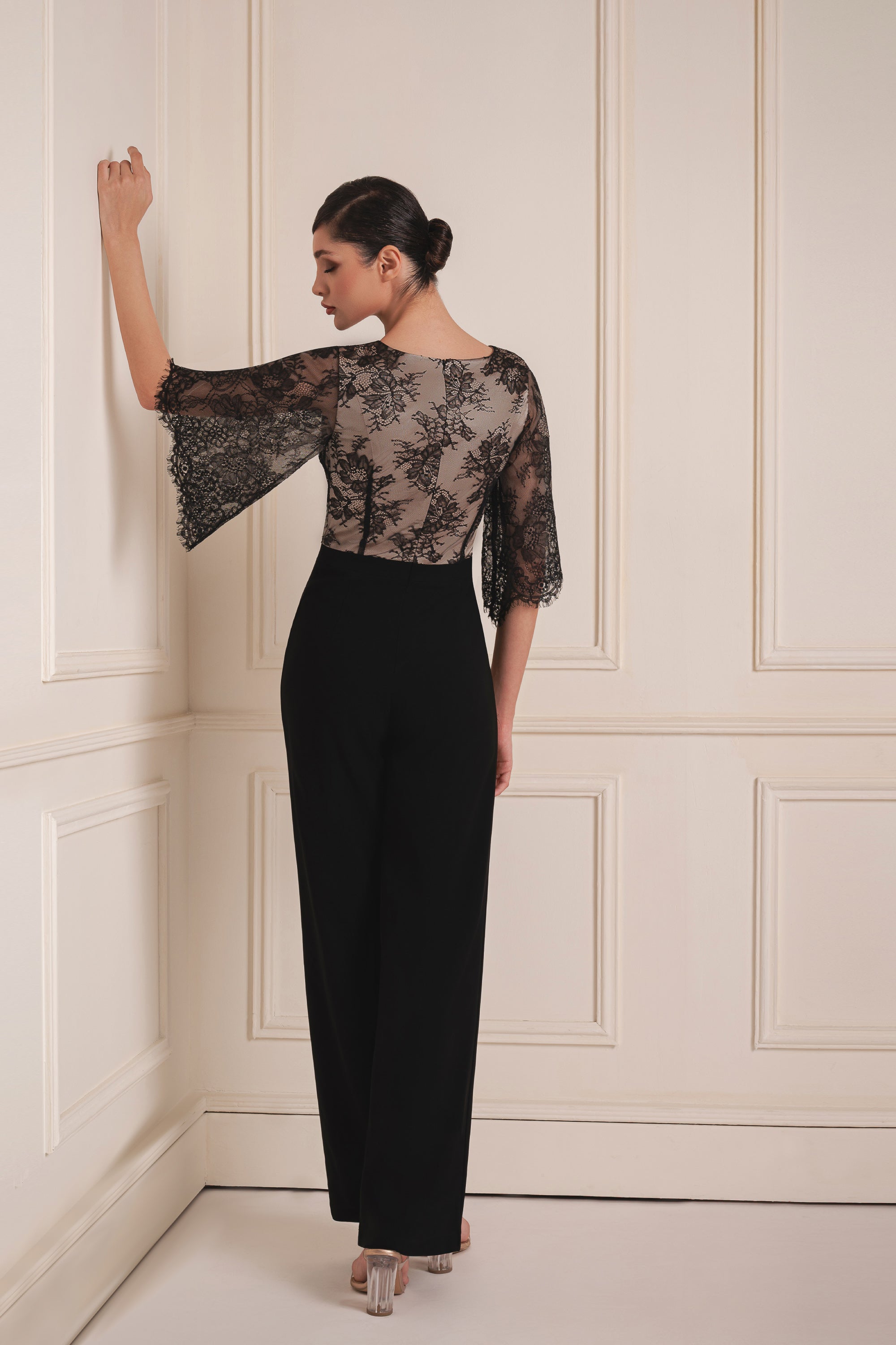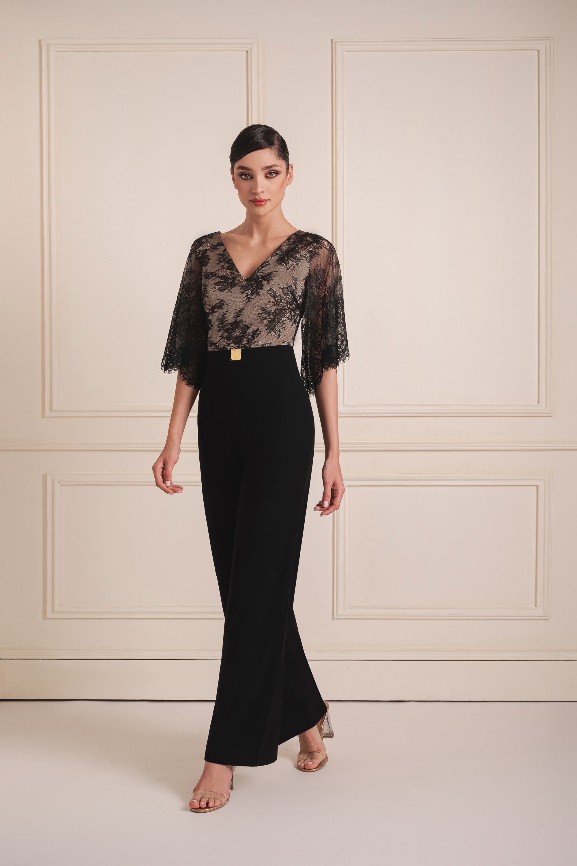 Where structure meets allure—this jumpsuit features a delicate lace bodice with statement flare sleeves, seamlessly blending elegance and edge. Cinched at the waist with the signature Cherine Fakhry embellishment, it’s a timeless expression of sophistication.