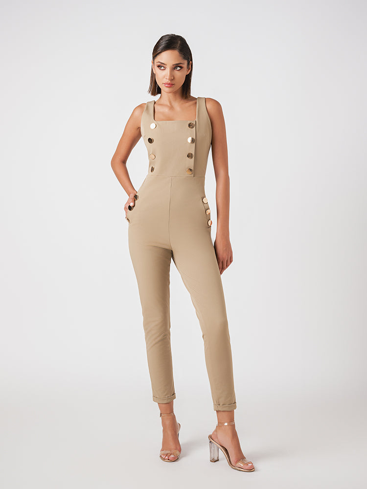 Elevate your style with our chic jumpsuit, featuring signature gold button details on the bodice and handy pockets. This fitted design hugs your curves and tapers at the ankle for a sleek, modern look. Perfect for any occasion, it's a timeless wardrobe staple.