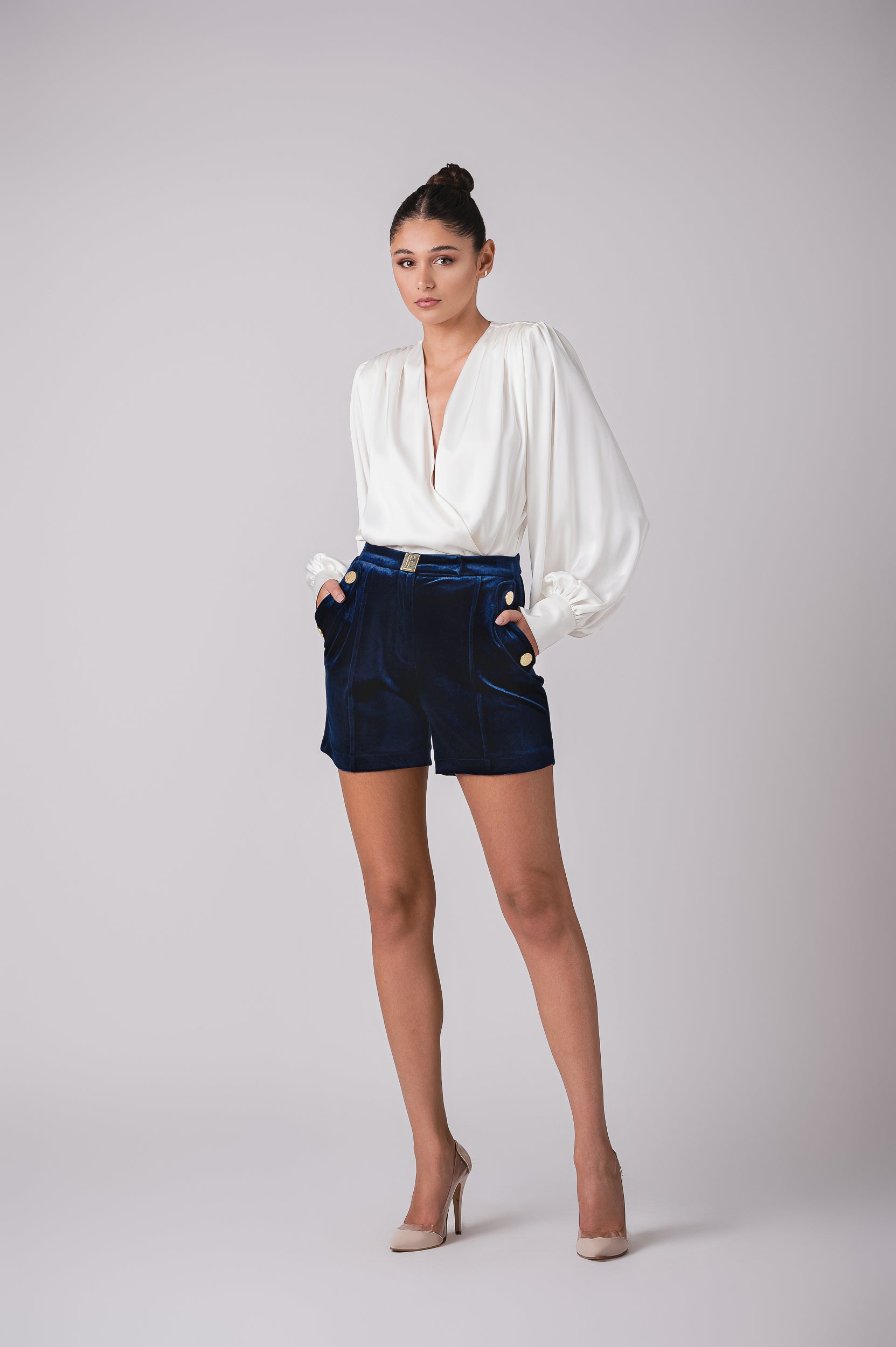 Elevate your style with our High-Waisted Velour Shorts, featuring the iconic Cherine Fakhry gold buckle, a chic and luxurious addition to your wardrobe. These shorts offer a flattering high-waisted design, combining style and comfort. Crafted with meticulous attention to detail, they are a fashion essential that ensures you stand out with grace and style.