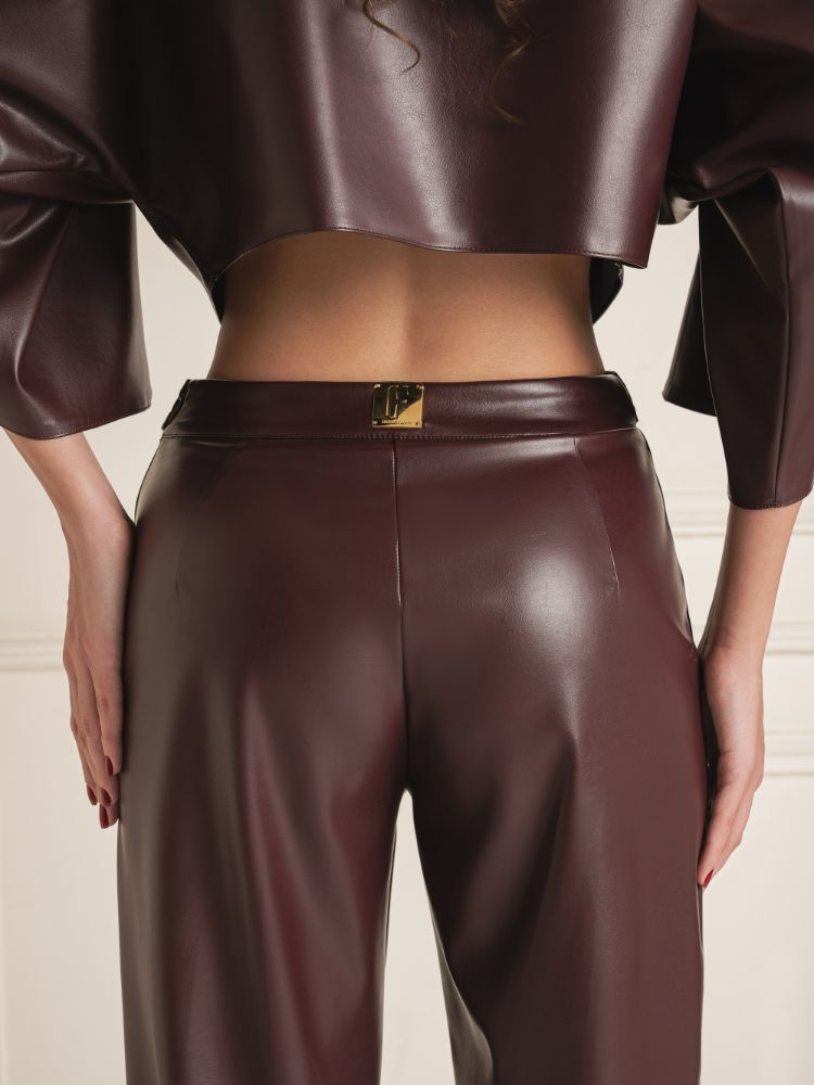 This Leather-Look Pant & Top Set features a high-neck, wide-cut top paired with tailored pants. Designed for a bold, modern look, it offers sleek sophistication with an edgy, contemporary flair.