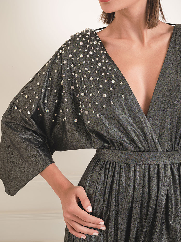 Shimmer in our dazzling Long Kimono Sleeve Dress. Crafted from luxurious metallic fabric, it features a V neckline, chic faux belt, and embellished sleeve for added glamour. The open V back and high leg slit enhance elegance and movement. Perfect for galas and evening soirées, this dress blends modern design with timeless allure.
