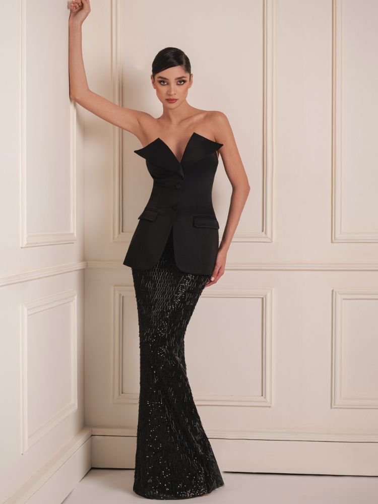 A dazzling combination of glamour and structure—this floor-length sequin skirt catches the light with every movement, while the satin structured bustier adds a bold, sculpted elegance. Together, they create a stunning, show-stopping ensemble perfect for unforgettable evenings.