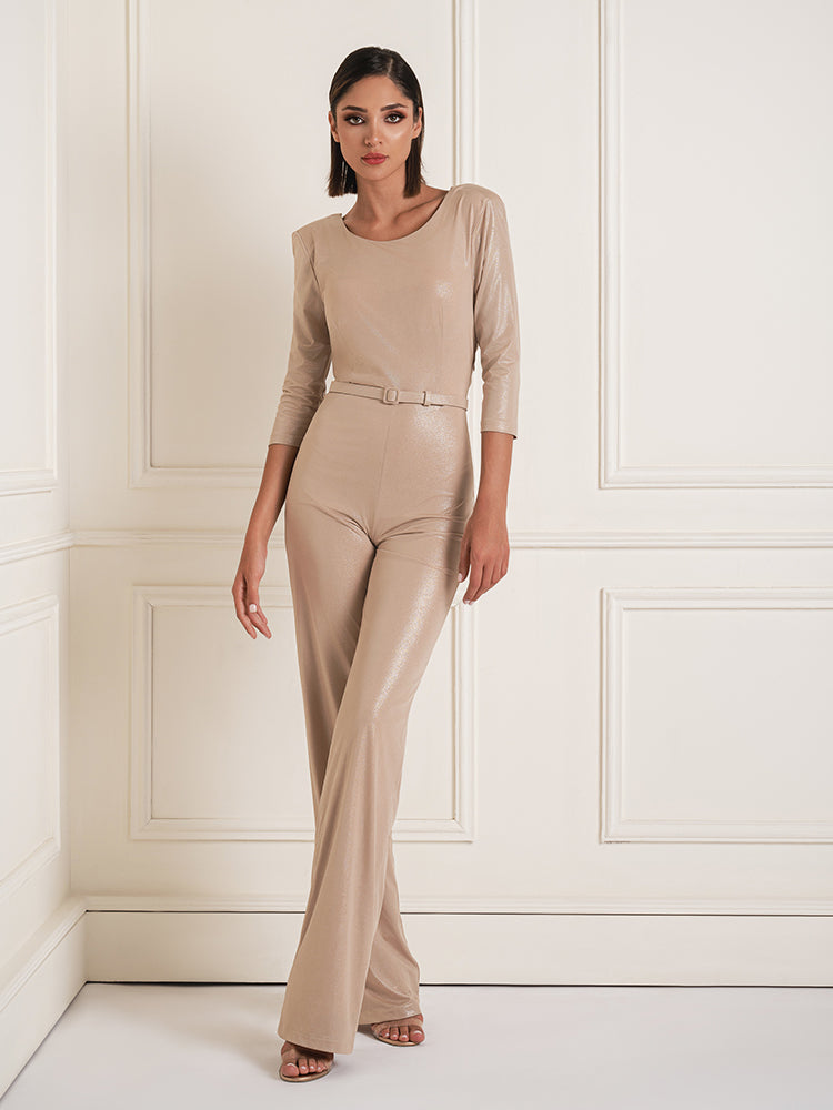 Shine bright in our Metallic Straight Leg Jumpsuit. Crafted from luxurious metallic fabric, it features 3/4 sleeves, structured shoulder pads, and a thin waist-cinching belt for a flattering fit. The low draped back with a gold chain detail adds a touch of glamour. An invisible zip ensures a seamless closure. Perfect for evening soirées or cocktail parties, this jumpsuit combines style and allure effortlessly.