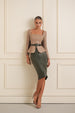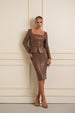 A sculpted leather midi skirt set designed to command attention. The structured bodice and defined seams contour the silhouette, while the voluminous puff sleeves add a bold, architectural edge. Finished with a sleek, fitted skirt, this piece balances strength and femininity