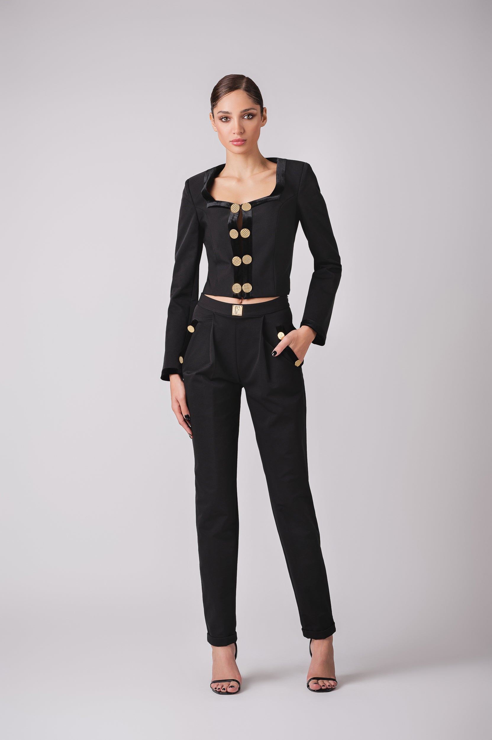 Tailored Jacket And Pant Set With Velour / Satin Trimmings And Gold Buttons