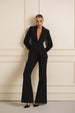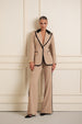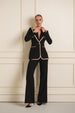 A refined take on power dressing. This tailored suit is defined by sharp lines and contrast trim that sculpts a confident silhouette. Structured shoulders and fluid wide-leg trousers create a balanced, modern look. Elegant, effortless, and quietly commanding.