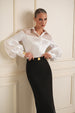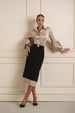 A sculptural blouse defined by a sheer neckline detail and dramatic puff sleeves. A balance of structure and softness for a modern, feminine silhouette.